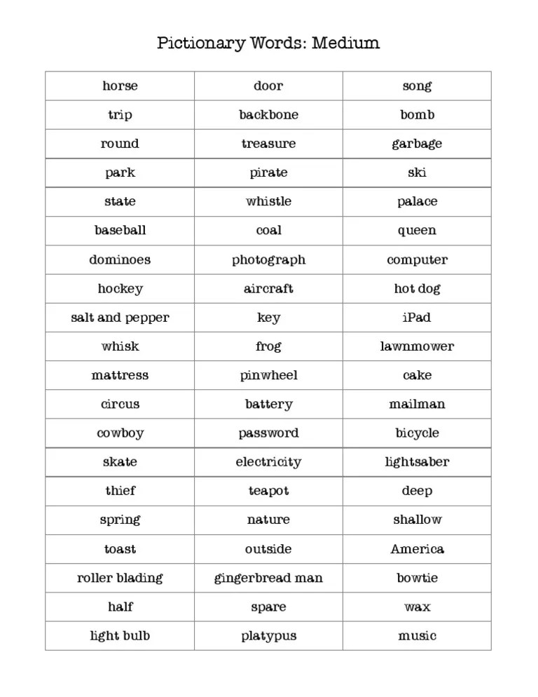 Free Printable Pictionary Words - Web june 4, 2022 · free printable where can i find free printables? Web by jeannette tuionetoa on april 4, 2022 affiliate links may have been used in this post. Web this free disney themed pictionary printable game for kids is a fun, low prep activity. What do i print at no cost? Web free printable summer pictionary game 0 comments summer is the perfect time to relish the outdoors and spend quality time with loved ones while enjoying. The tree is up, the gifts are wrapped and ready (most of them. Click on the words you like the best. Click any of the links below, print out the lists, cut into strips, mix and match, and enjoy! It’s no secret that we love to play board games as a family. Web pictionary words for kids:
