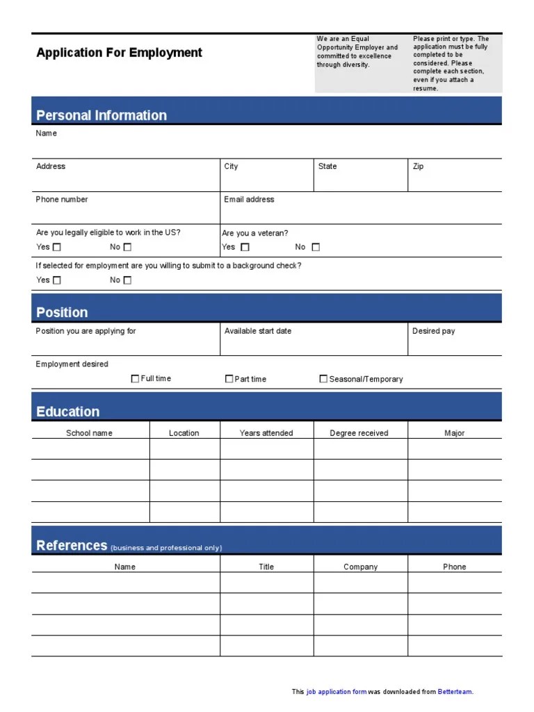 Please complete each section, even if you attach a resume. In order to ensure this application is acceptable, please print or type with the application being fully completed in order for it to be considered. A job application allows individuals to enter their personal details, skills, and work experience to apply for employment. You can print the forms and fill them out by hand using a pen or edit them on your computer using a free pdf reader such as adobe acrobat reader. City state zip phone number. Web this job application form was downloaded from betterteam. This post discusses the benefits of using printable job applications and provides you with links to 12 different types of employment forms you can use. There are no sections for an applicant signature or legal disclaimers and voluntary statements. Also, you can download the templates and affix them to your main website for the applicants willing to apply for the relevant position. Web one way to streamline the process is to use printable job application forms. Here you will find several examples of standard job application forms in pdf format, printable and valid for applying for a job. Web in this article, learn how to create a standard application job form for your business and use the template and sample to create your own. Web we have free printable application for employment template; You can simply download them and give to the applicant for selecting a competent employee for the job position. It gives an employer a snapshot of whether the applicant is the right person for an open position. Download generic employment application template excel | word | pdf | smartsheet printable job application. The application must be fully completed to be considered. These are forms that applicants can fill out and submit online or in person. I, the applicant, certify that my answers are true and honest to the best of my knowledge. Web standard application for employment it is our policy to comply with all applicable state and federal laws prohibiting discrimination in employment based on race, age, color, sex, religion, national origin, disability or other protected classifications.